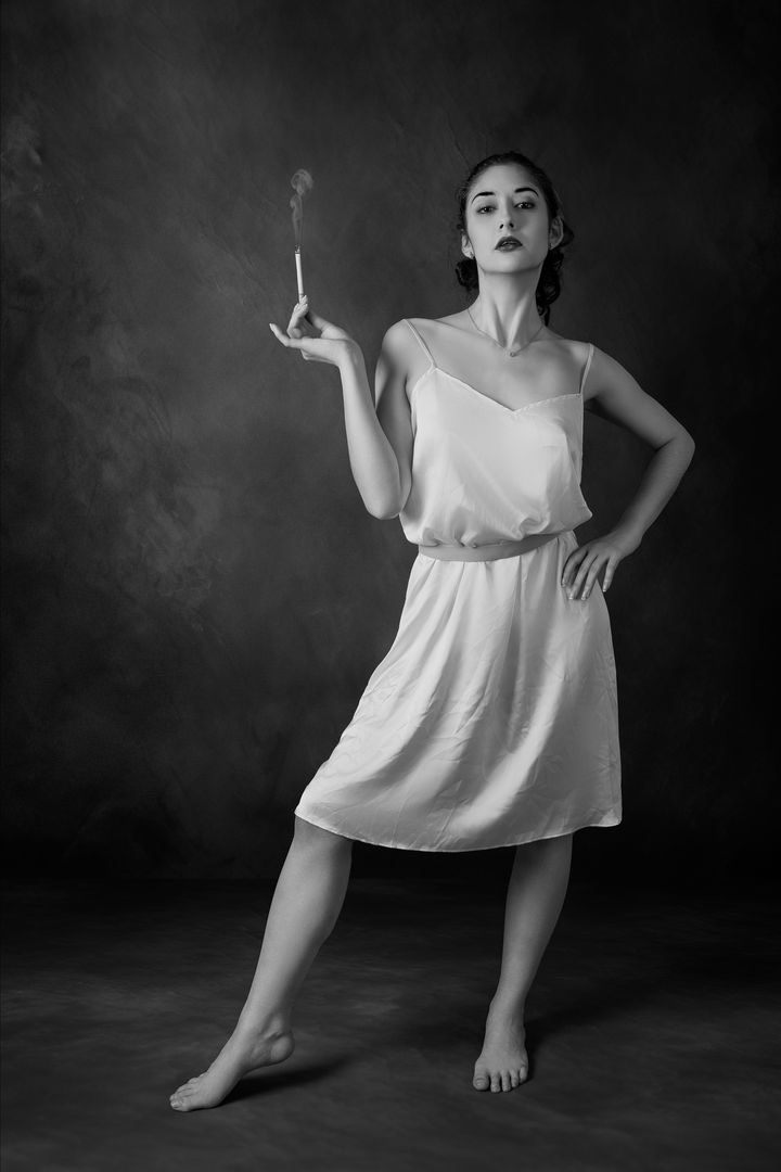 En esta colección de fotografías, el manejo de la luz es puramente artesanal. Utilizo esquemas de iluminación inspirados en los retratistas de los grandes estudios de los años 40. Busco esa "luz de mariposa" o el dramatismo de las sombras de persiana que transforman un rostro en un paisaje de emociones. El objetivo es que cada retrato parezca un fotograma perdido de una película de cine negro o un melodrama de Douglas Sirk.