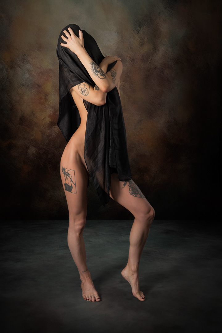 La Puesta en Escena y la Toma: En el estudio, el control de la luz es fundamental. Utilizo esquemas de iluminación inspirados en Rembrant y su famosa claraboya, el sfumato de Da Vinci o el dramatismo de Caravaggio. La captura es solo el esqueleto de la obra final.